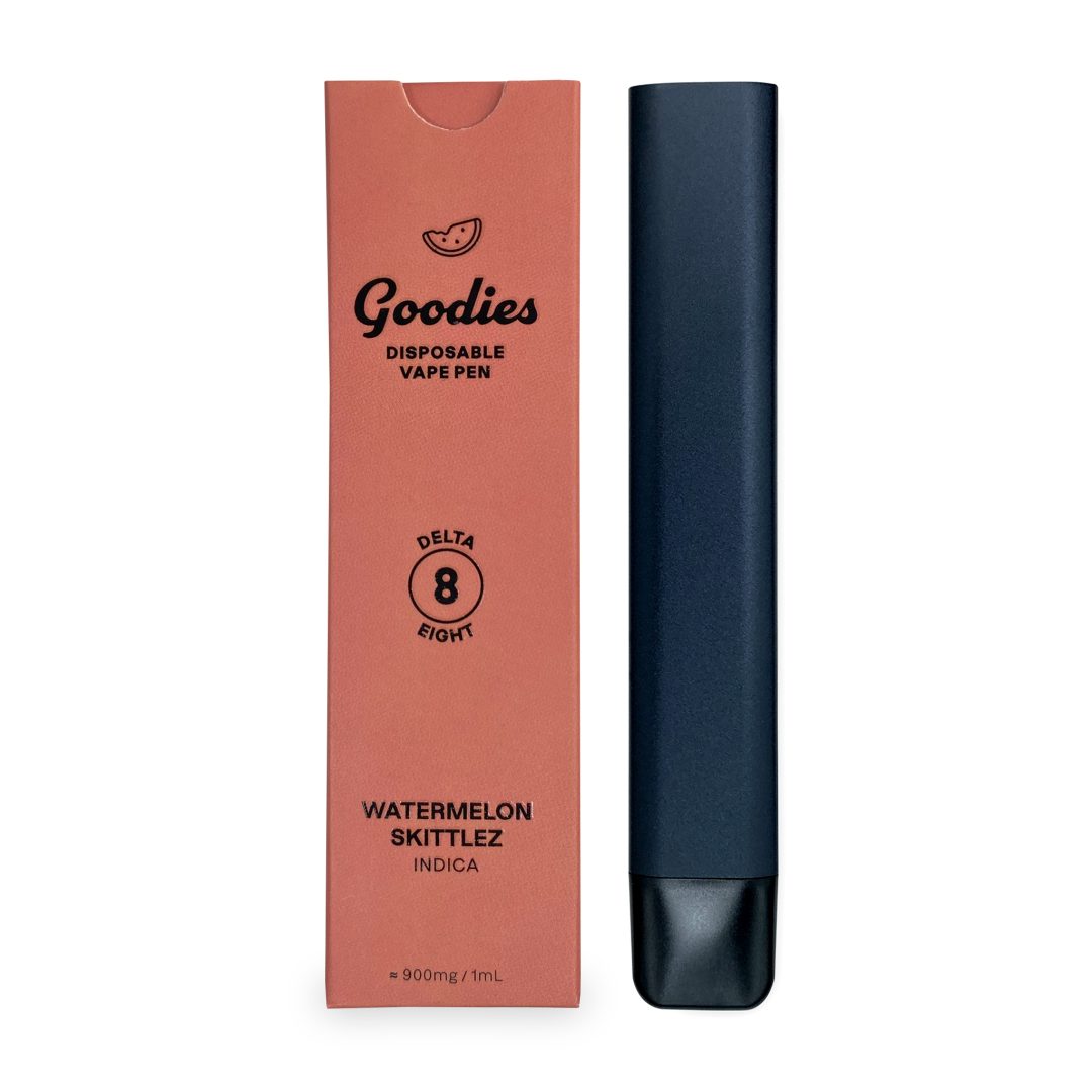 Buy Goodies Watermelon Skittlez Delta-8-THC YRK Disposable Vape Online. The Goodies Watermelon Skittlez Delta-8-THC Disposable Vape is an Indica strain made from a cross of Zkittlez and Watermelon.  Easily one of the most pungent and flavorful strains out there, it has strong waves of watermelon coupled with hints of lemon.